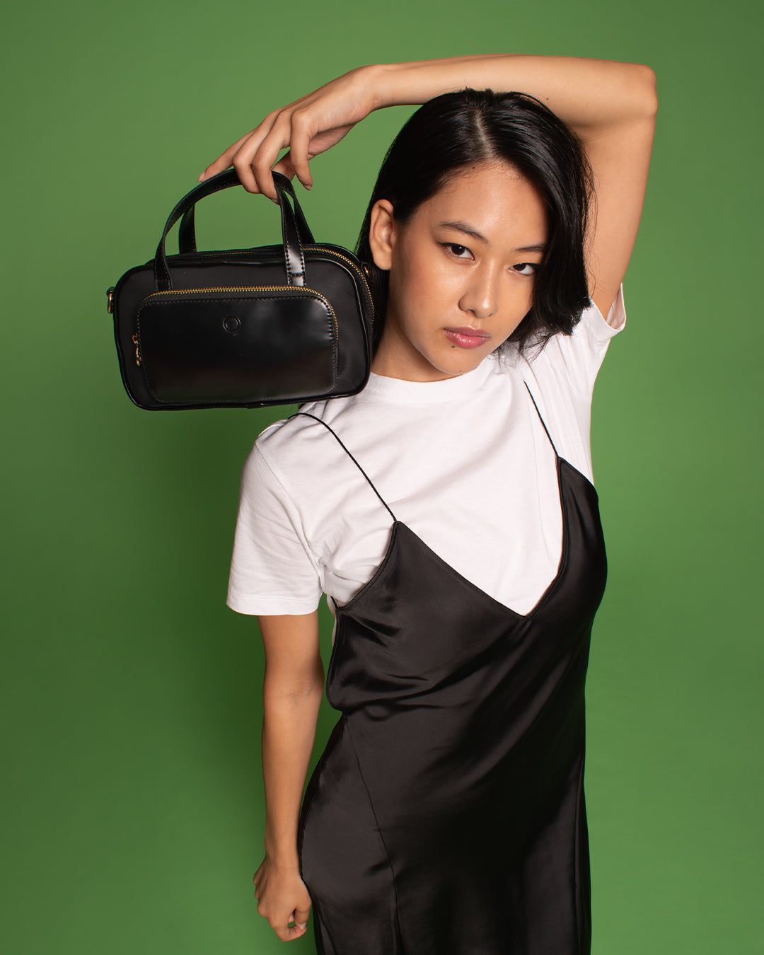Bag with zip fastening, handle and shoulder strap. The product is lined inside, has internal compartments and an external pocket with a nappa effect. The accessory is made of Nylon, a practical, lightweight and water-repellent material.