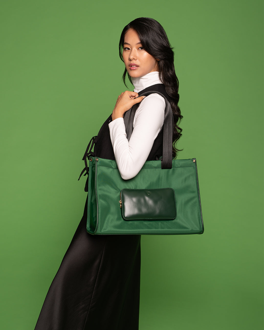 Vidutinio dydžio rankinė su užtrauktuku, dviguba rankena ir petnešėlėmis. Nuusegama ilga reguliuojama rankena. Viduje ir išorėje turi kišenėles. Išorinė kišenėlė su užtrauktuku. Rankinė pagaminta iš nailono – praktiškos, lengvos ir vandenį atstumiančios medžiagos, kuri yra blizgi ir maloni liesti. Metalinės detalės.