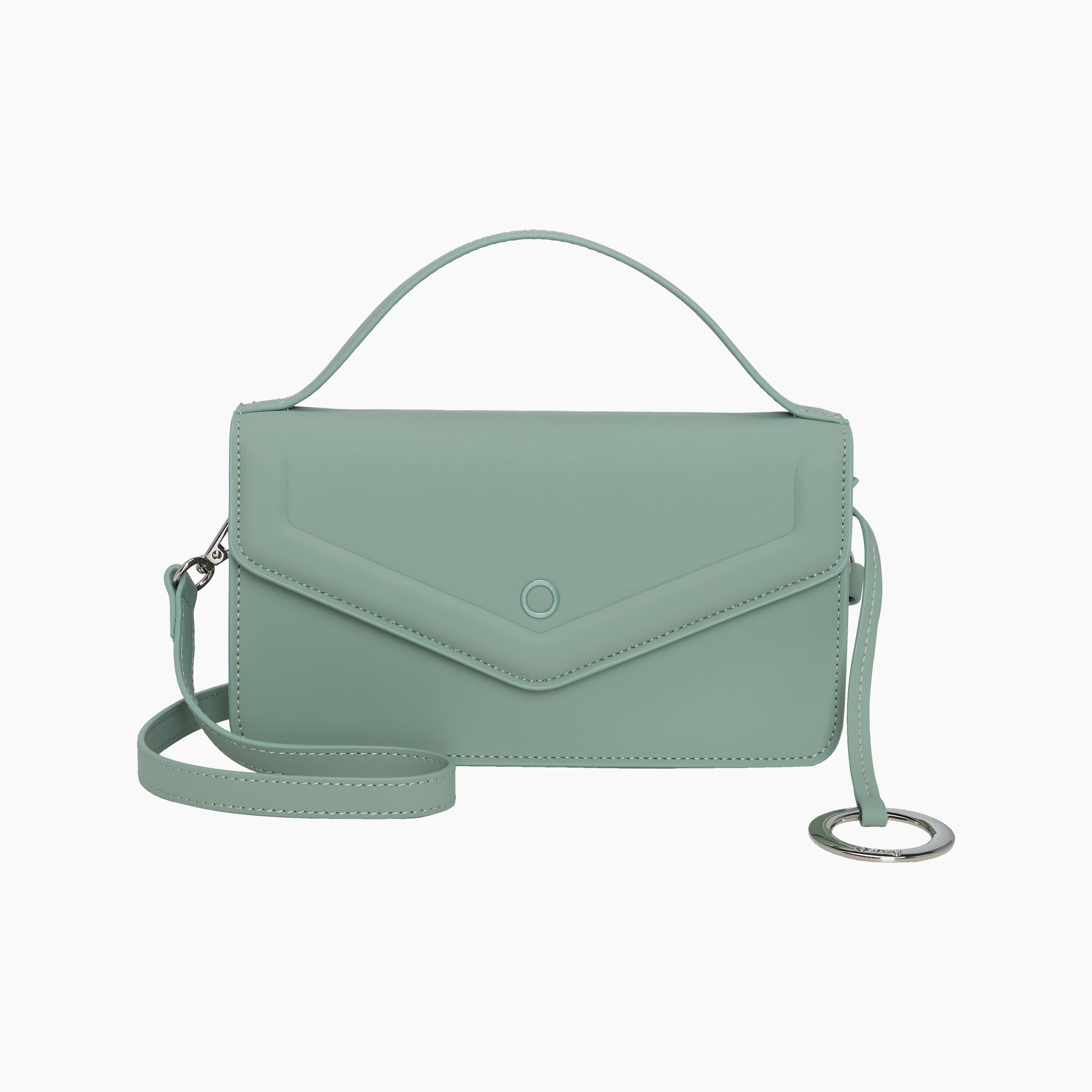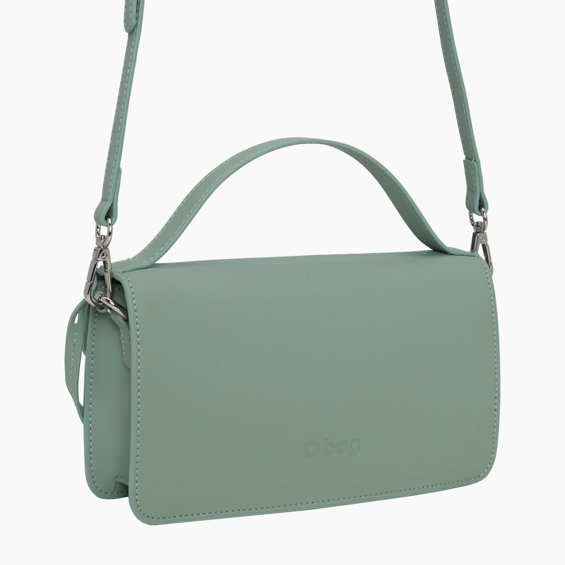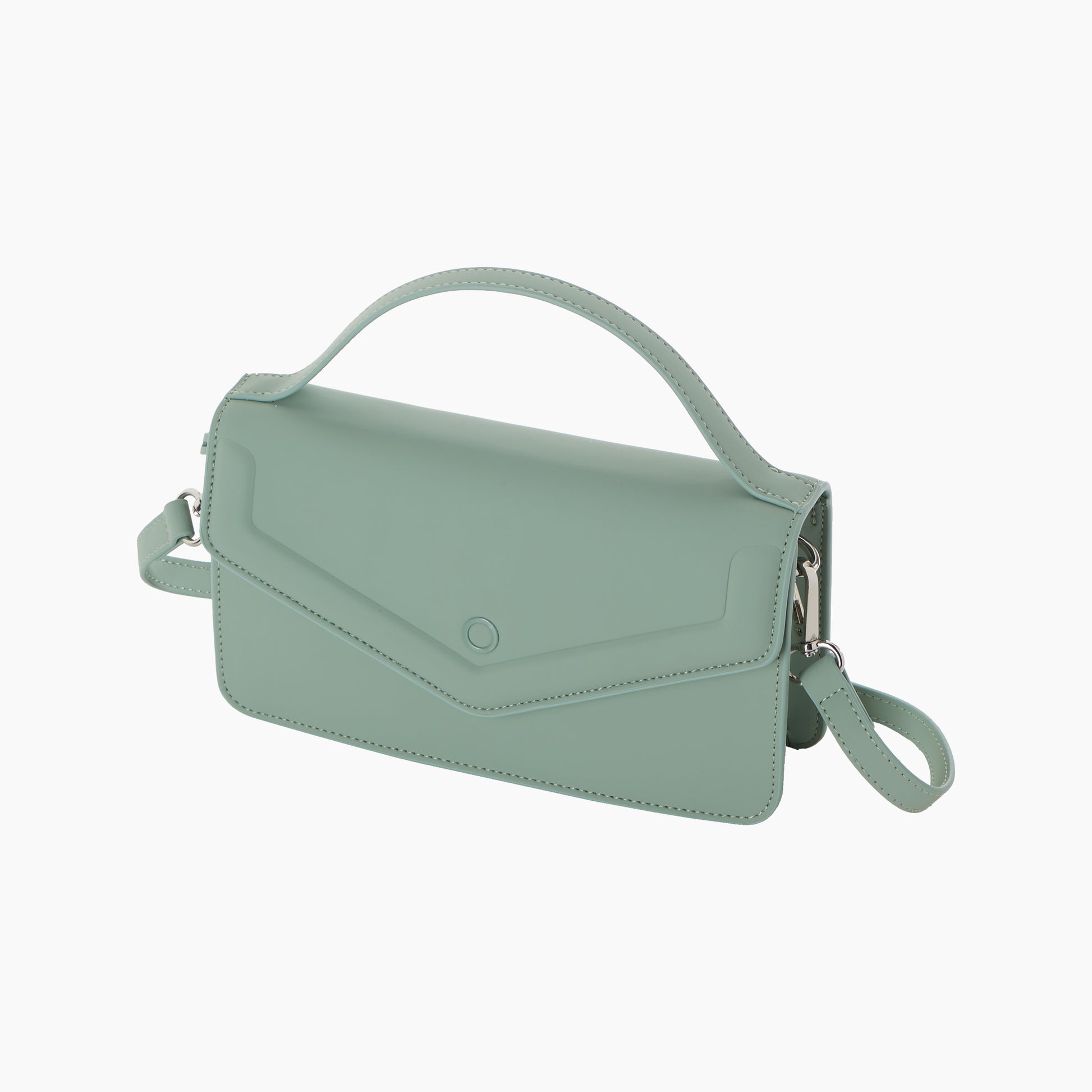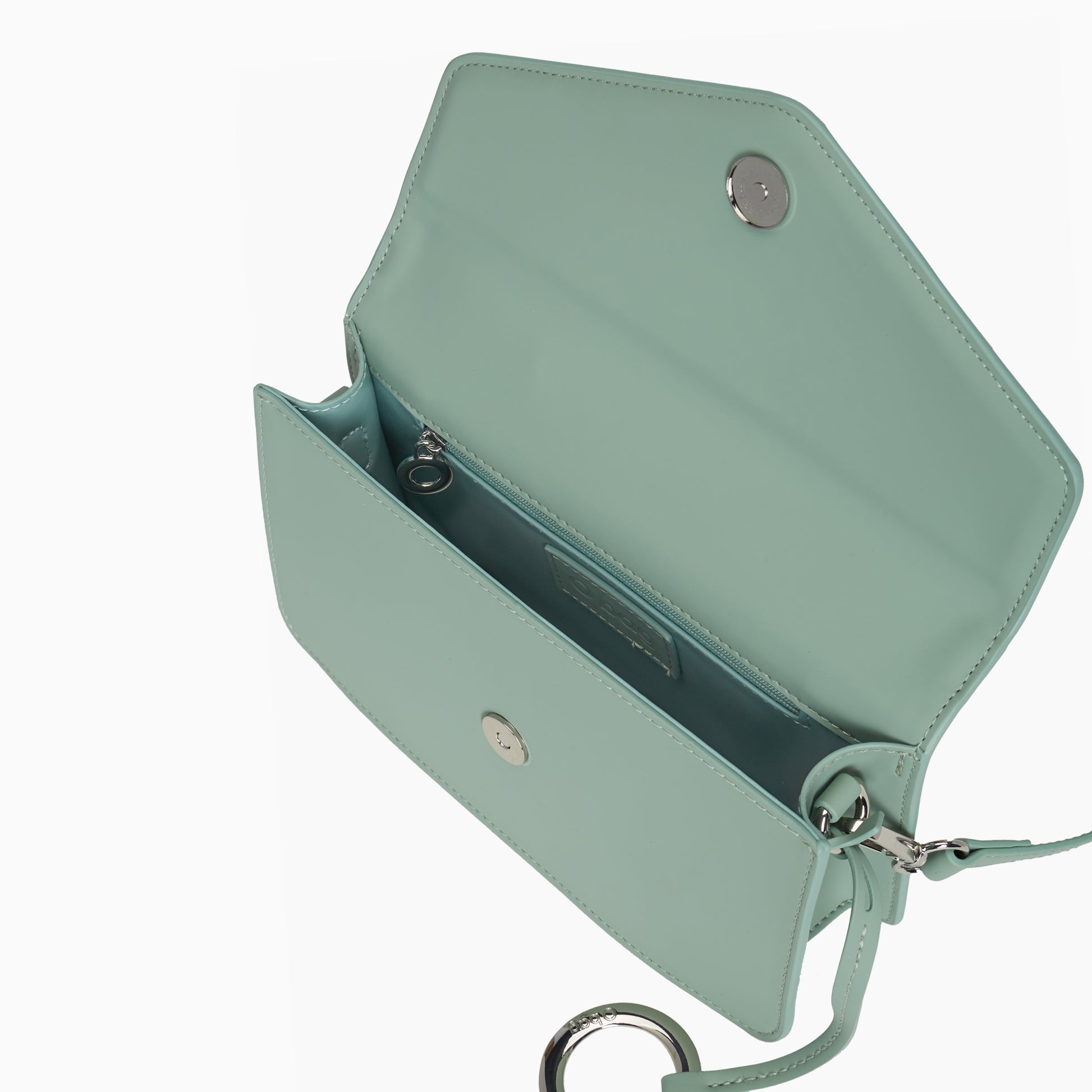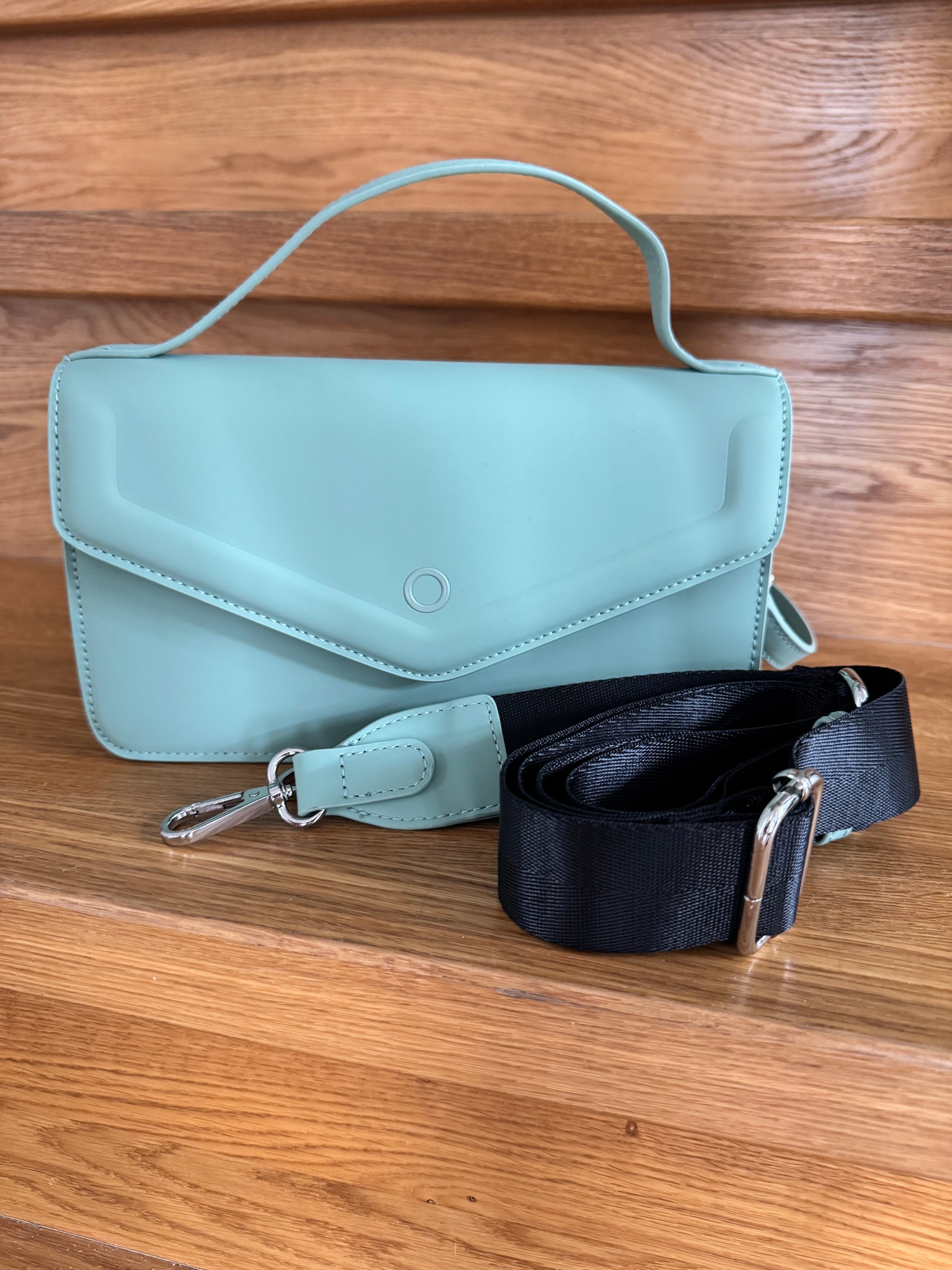 Minkšta ir švelni rankinė per petį iš gumuoto audinio. Trumpa rankena ir ilga rankena per petį. Rankenos segasi atsikrai. Rankinė yra su pamušalu ir vidine kišene su užtrauktuku.