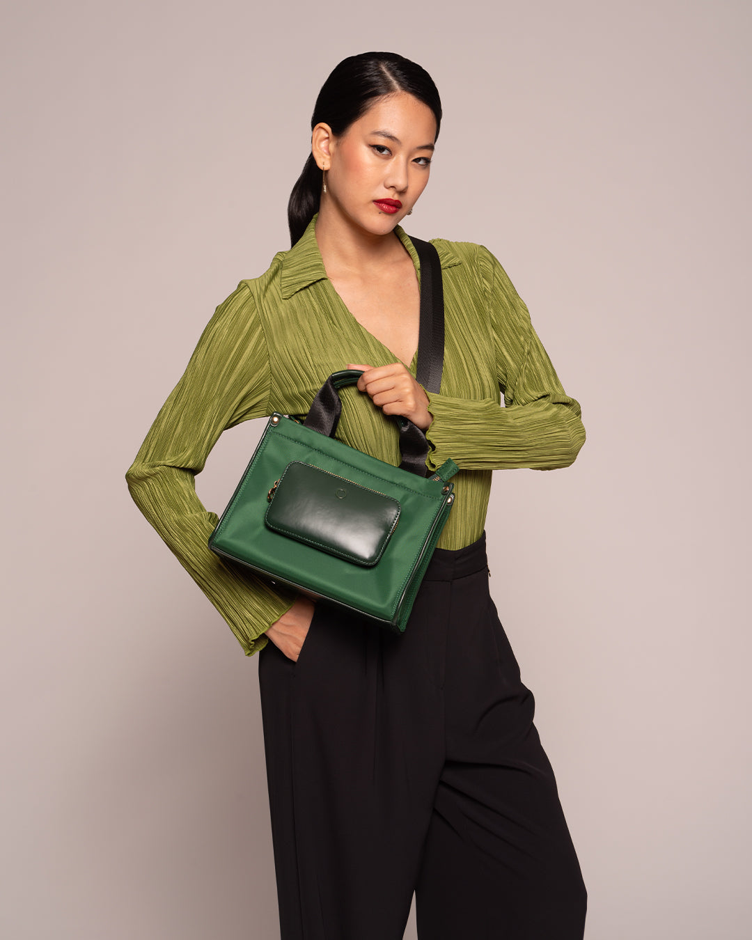 Rankinė su užtrauktuku, nusegama ilga reguliuojama rankena. Viduje ir išorėje turi kišenėles. Išorinė kišenėlė su užtrauktuku. Rankinė pagaminta iš nailono – praktiškos, lengvos ir vandenį atstumiančios medžiagos, kuri yra blizgi ir maloni liesti. Metalinės detalės.